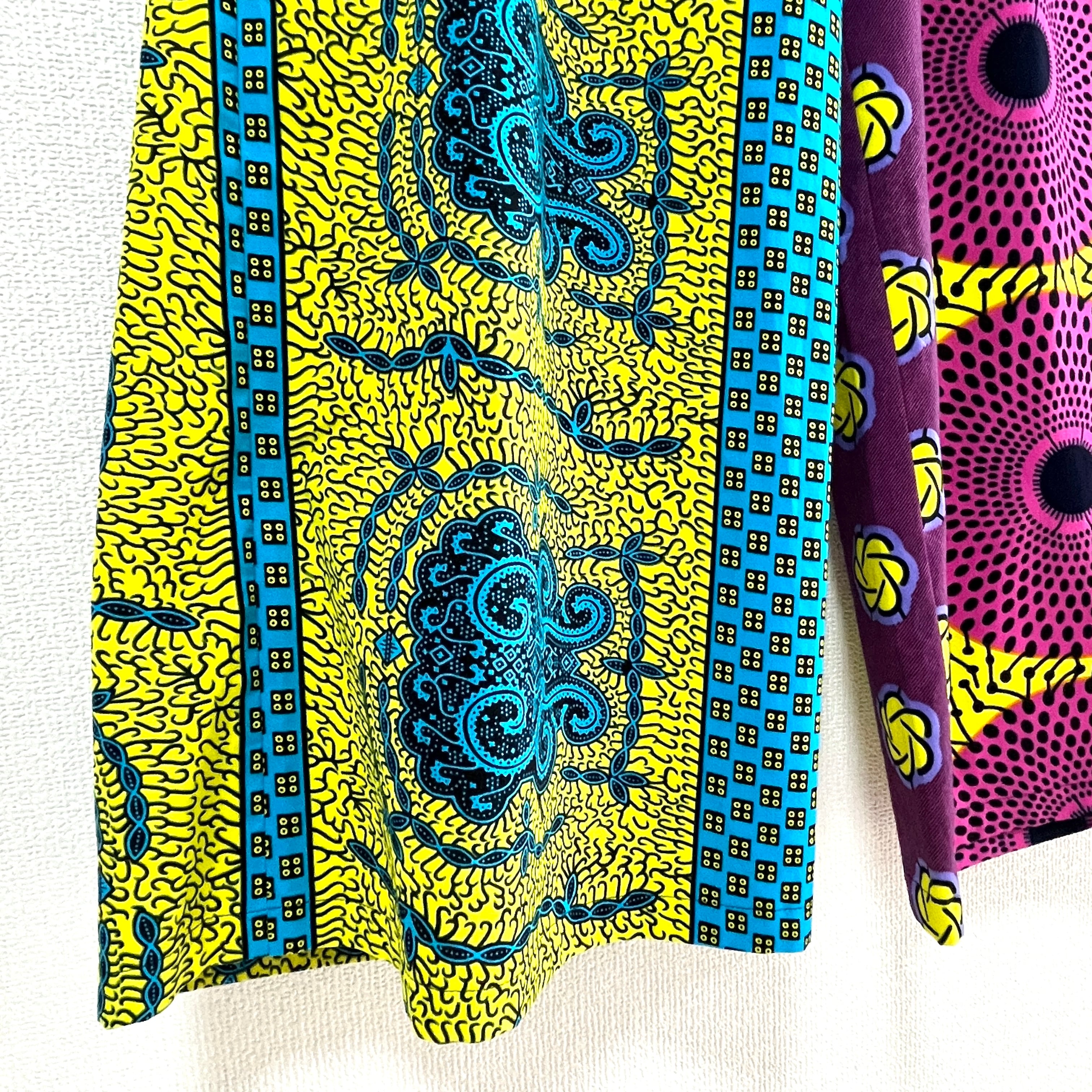 ・水通し済みですが、生地によってはアフリカンプリント特有の張り感が残っている場合があります。気になる場合はお洗濯してからご着用ください。(ご使用を重ねるうちに柔らかい質感になっていきます。)