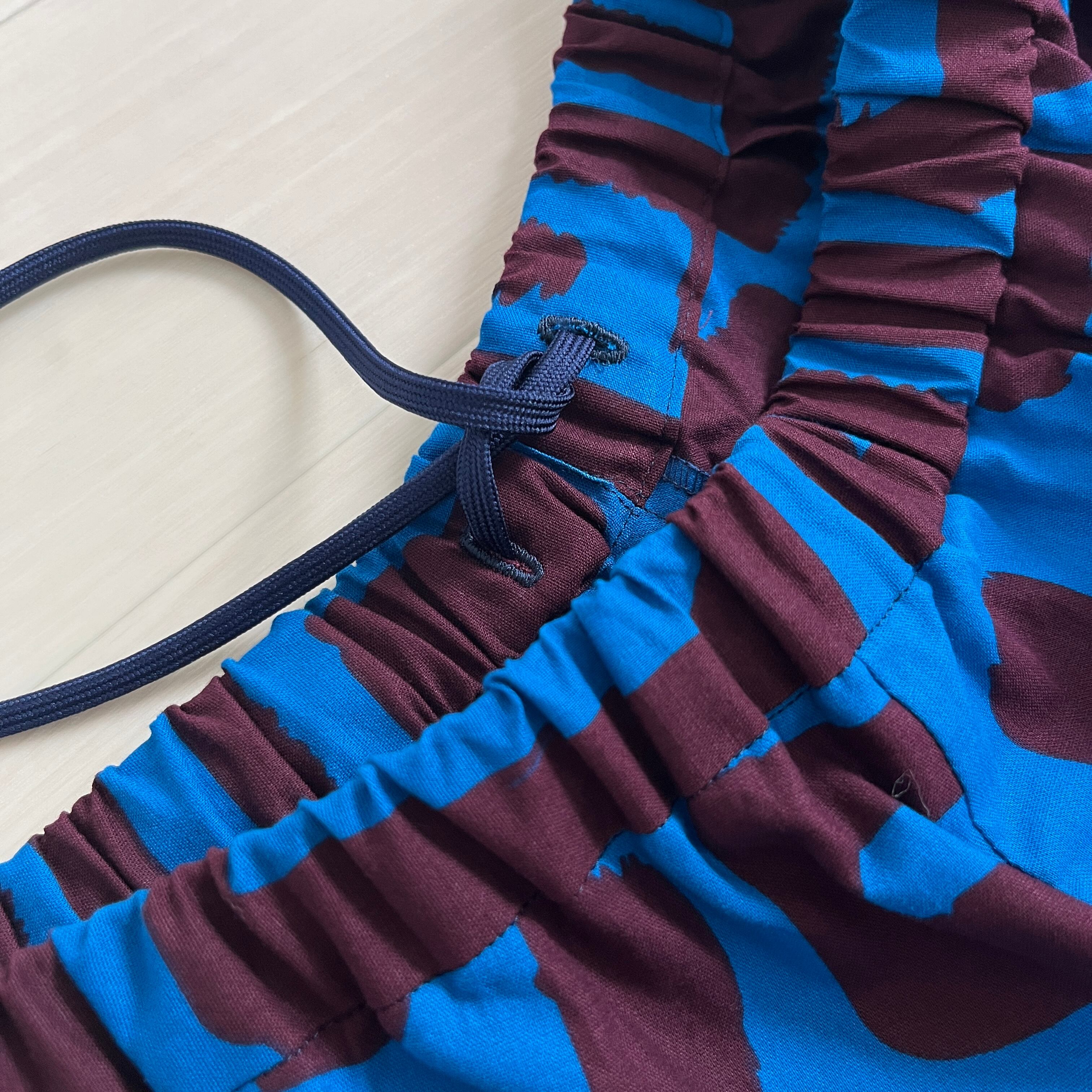 ・水通し済みですが、生地によってはアフリカンプリント特有の張り感が残っている場合があります。気になる場合はお洗濯してからご着用ください。(ご使用を重ねるうちに柔らかい質感になっていきます。)