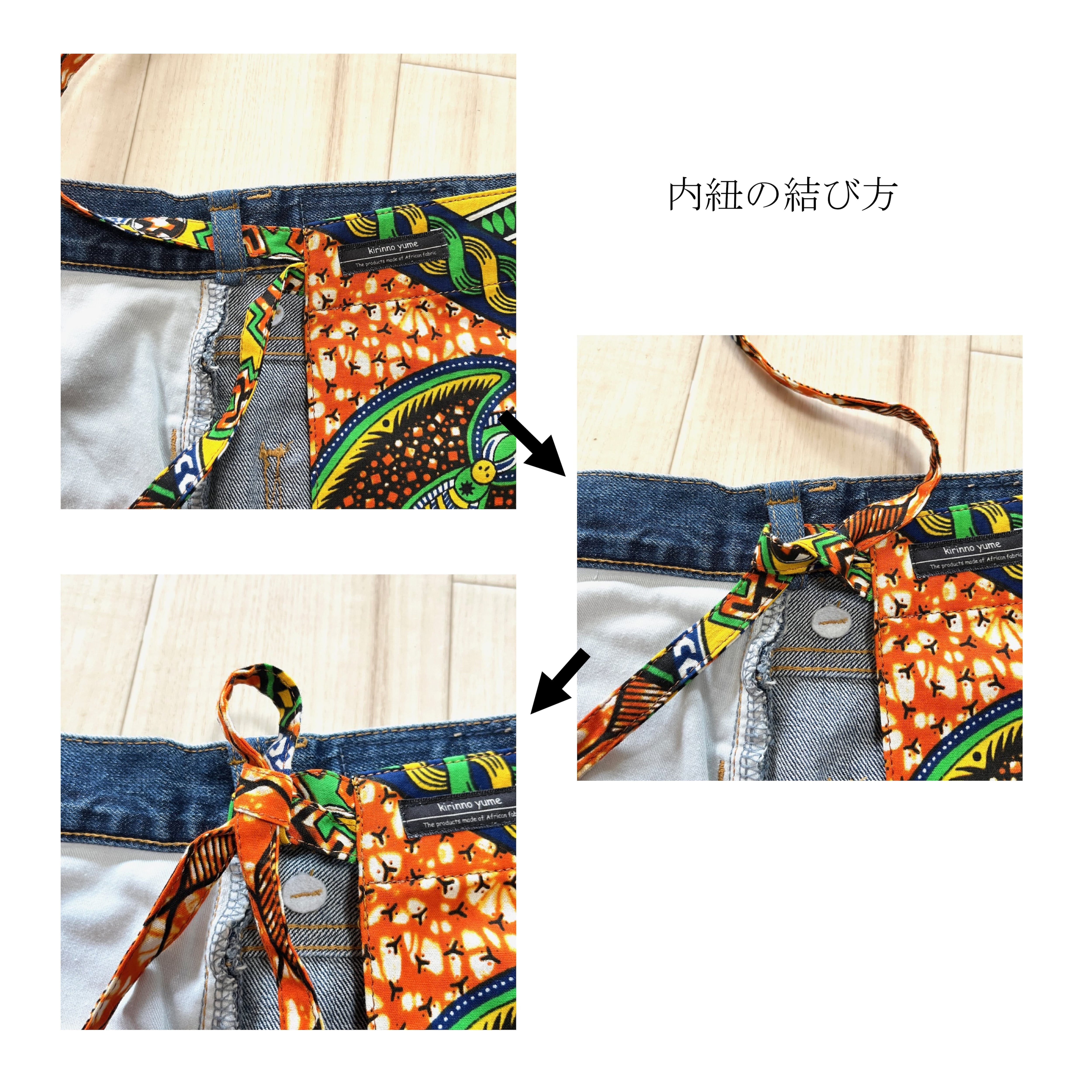 ※内紐の留め方は最後の画像をご参照ください。内紐をしっかり締めてしまうと、かがんだり座ったりした時に、腹部が圧迫されてしまうので、少し余裕をもたせて結んでください。
