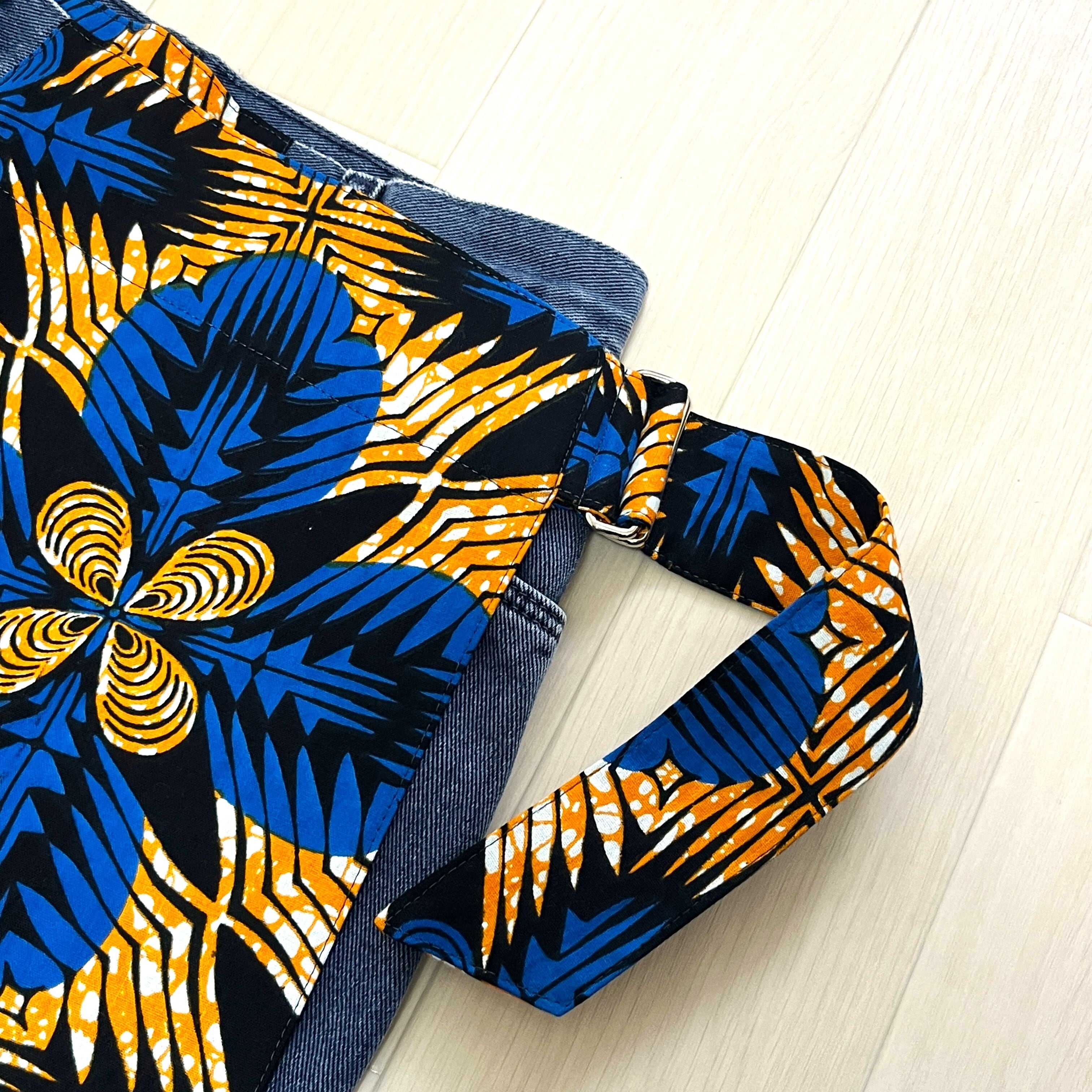 ユーズドデニムをアフリカンプリントでリメイクしたサスティナブルな一点物のラップスカート。