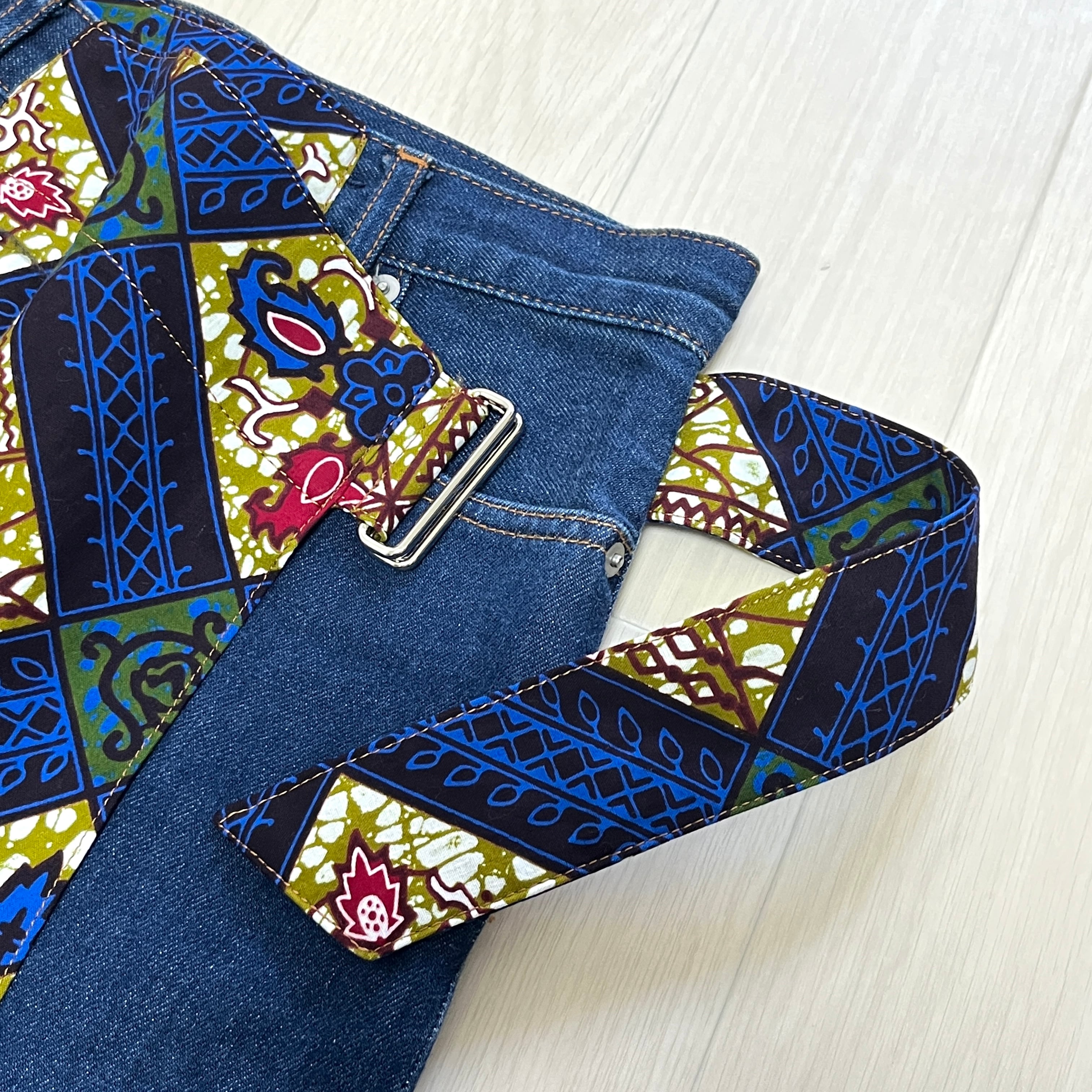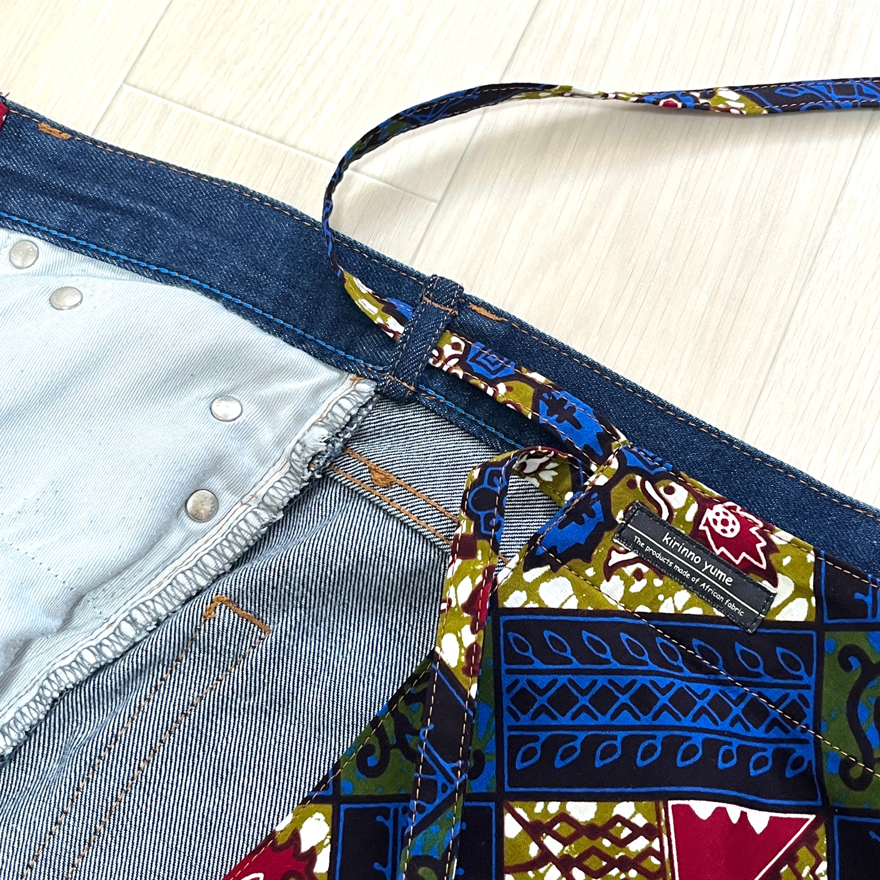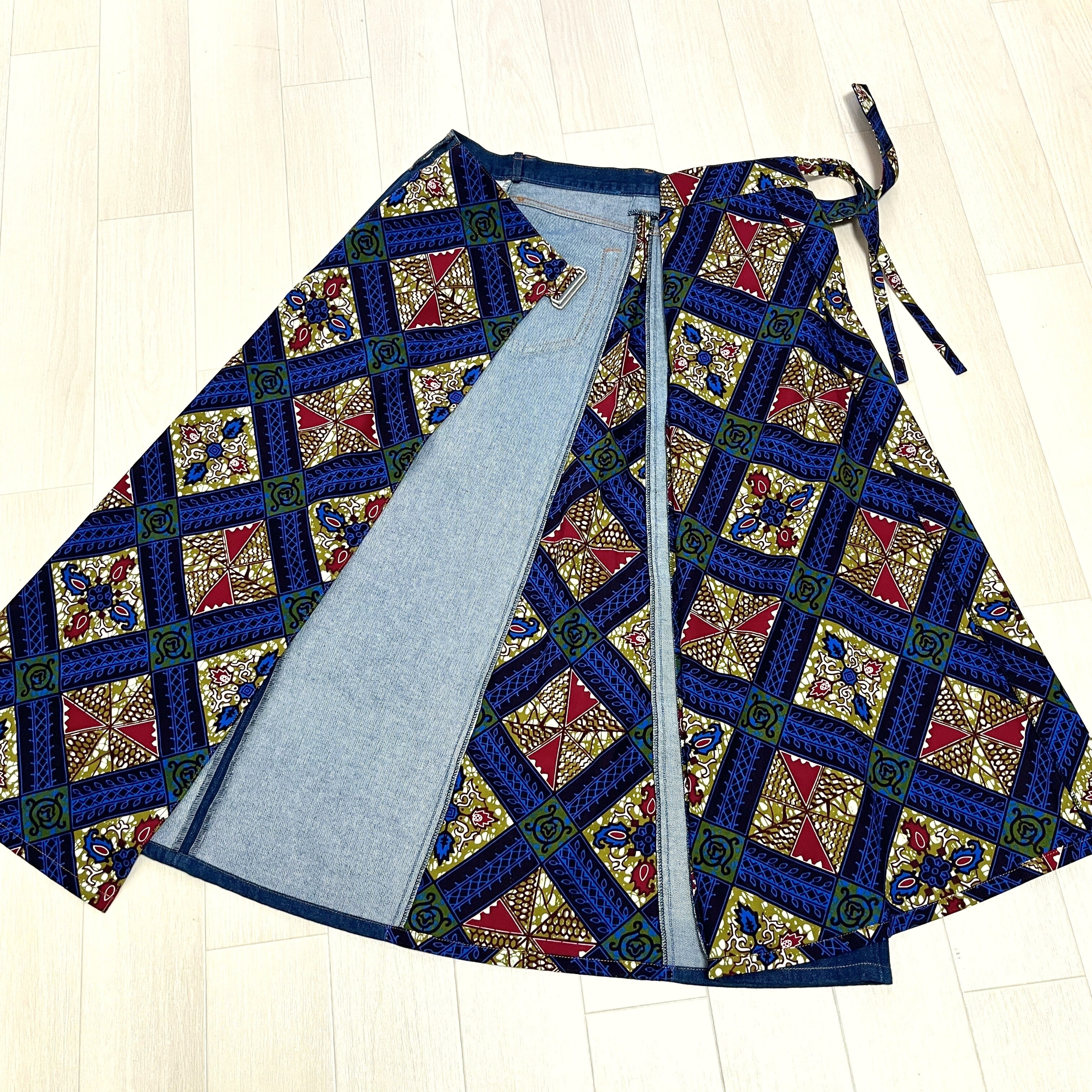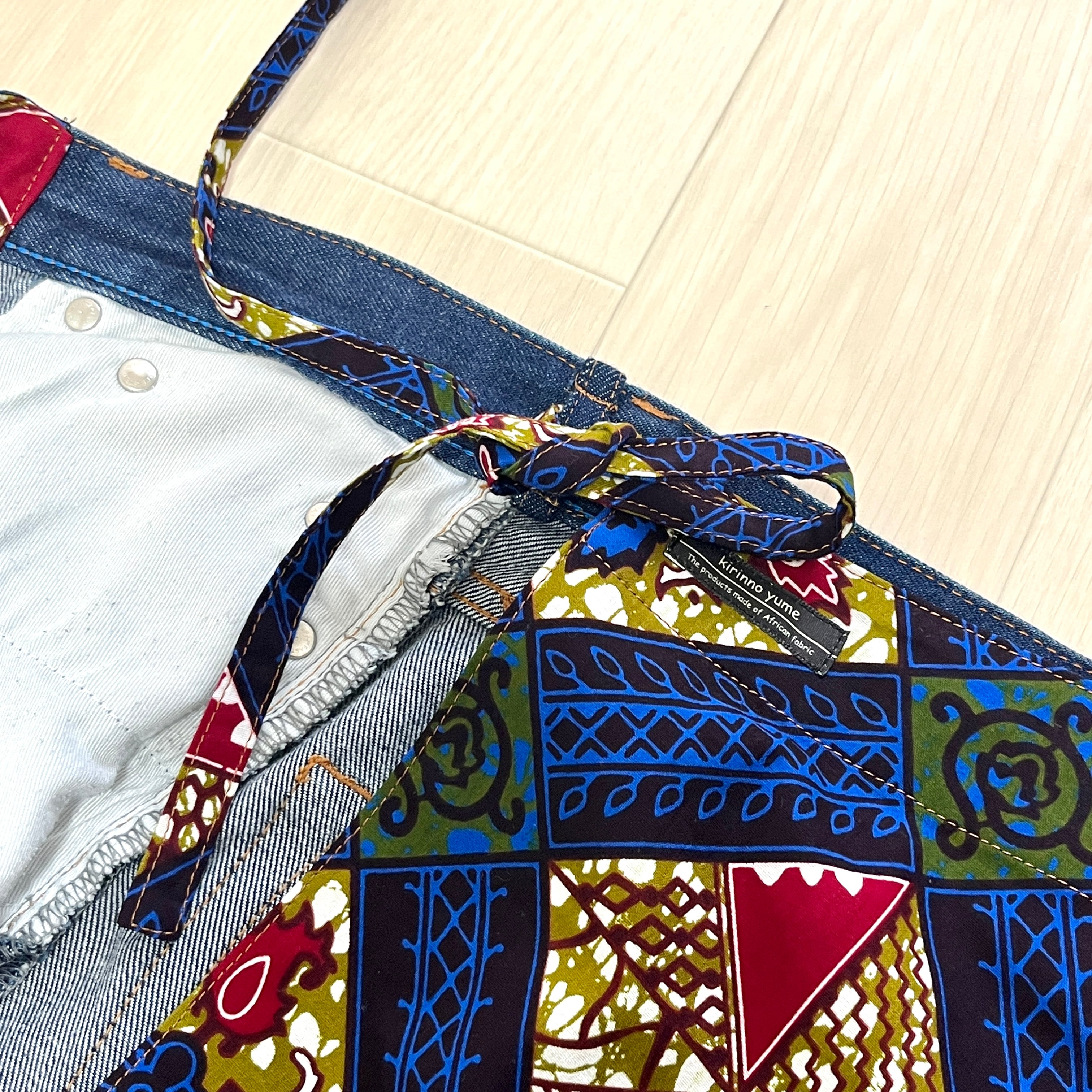 ユーズドデニムをアフリカンプリントでリメイクしたサスティナブルな一点物のラップスカート。