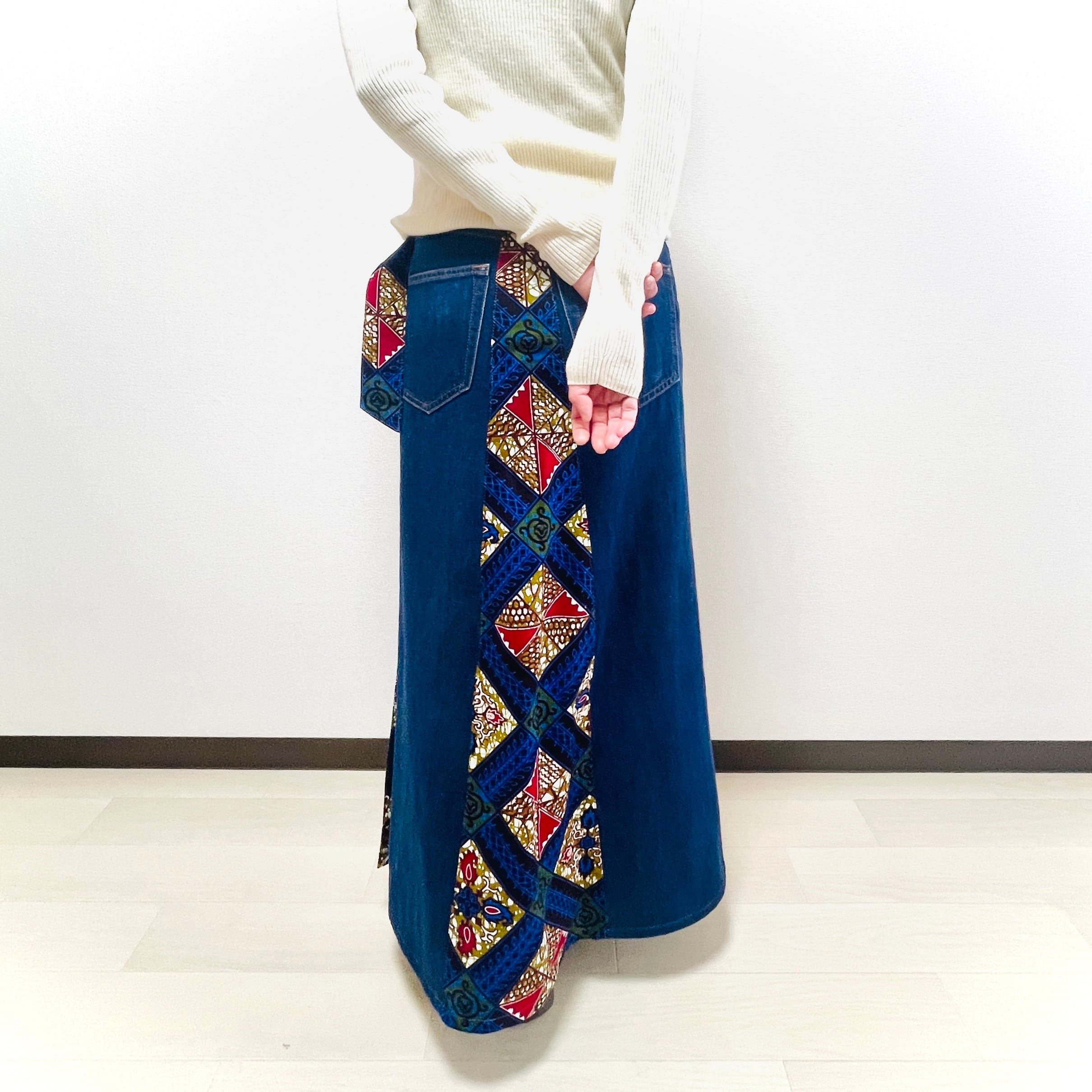 デニムリメイクラップスカート/アフリカンプリント/Moroccan
