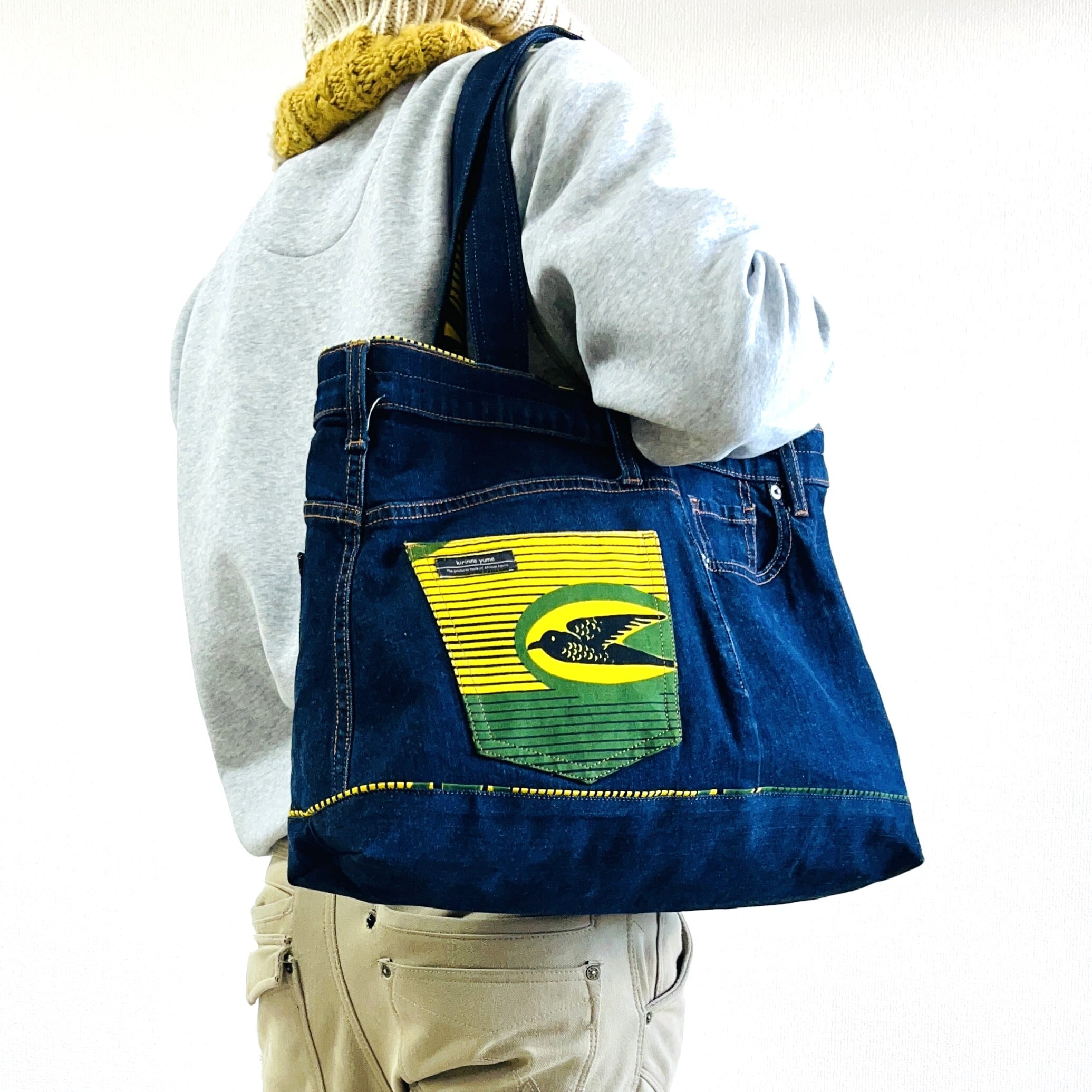 ユーズドジーンズをアフリカンプリントでリメイクしたサスティナブルな一点物のショルダーバッグ。
