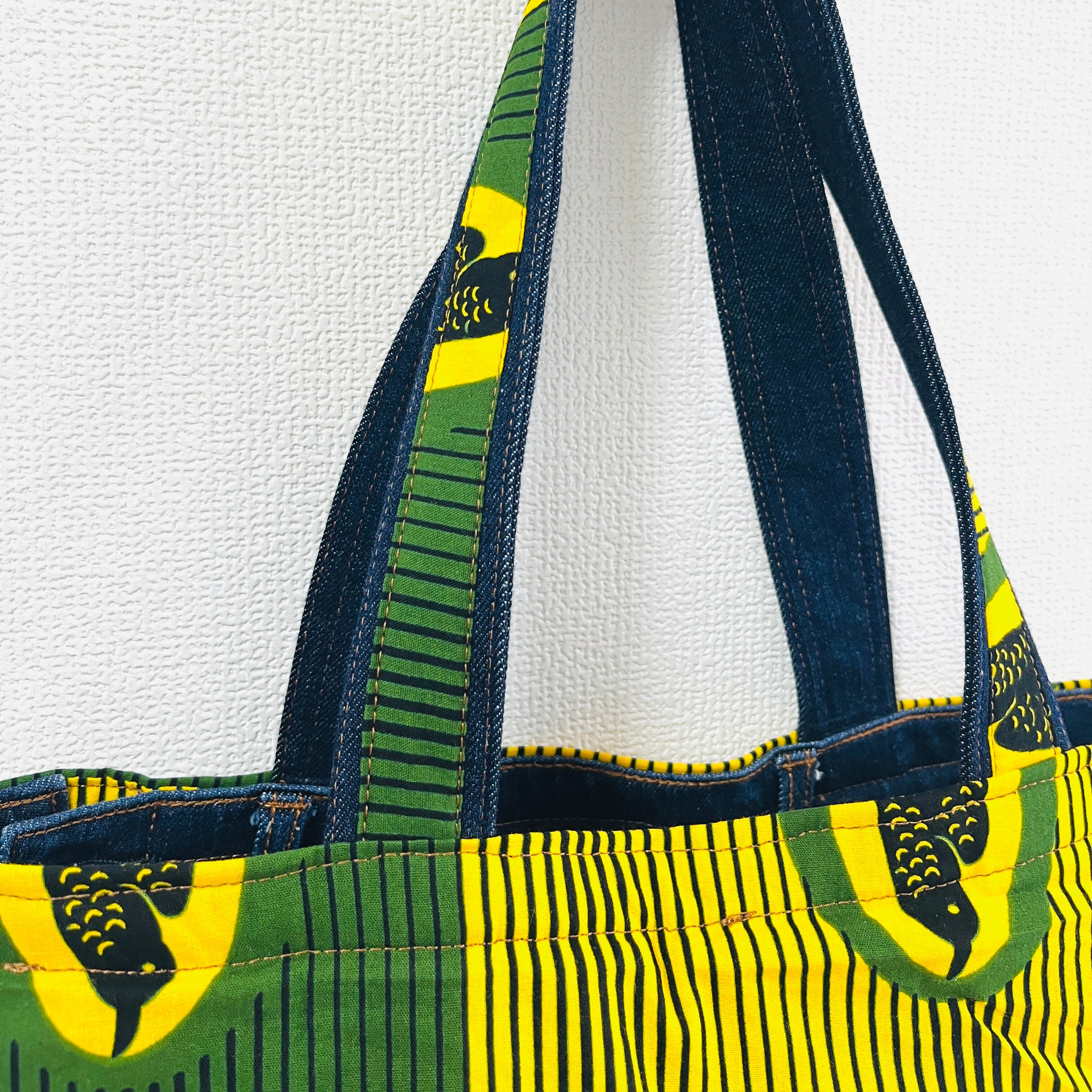 デニムリメイクショルダーバッグ/リバーシブル/アフリカンプリント/TSUBAME