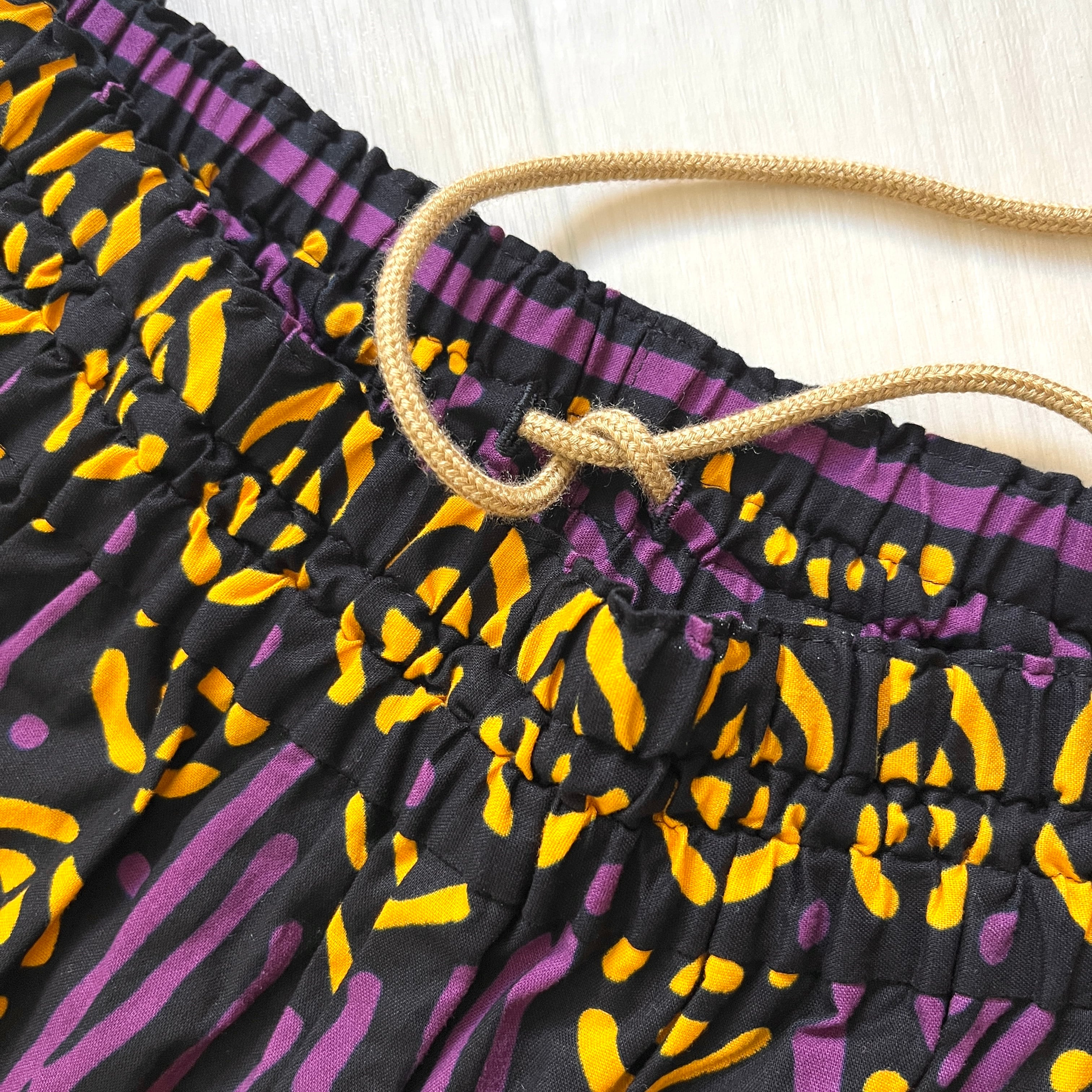 ・水通し済みですが、生地によってはアフリカンプリント特有の張り感が残っている場合があります。気になる場合はお洗濯してからご着用ください。(ご使用を重ねるうちに柔らかい質感になっていきます。)