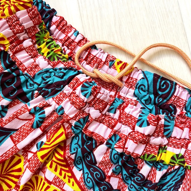 ・水通し済みですが、生地によってはアフリカンプリント特有の張り感が残っている場合があります。気になる場合はお洗濯してからご着用ください。(ご使用を重ねるうちに柔らかい質感になっていきます。)
