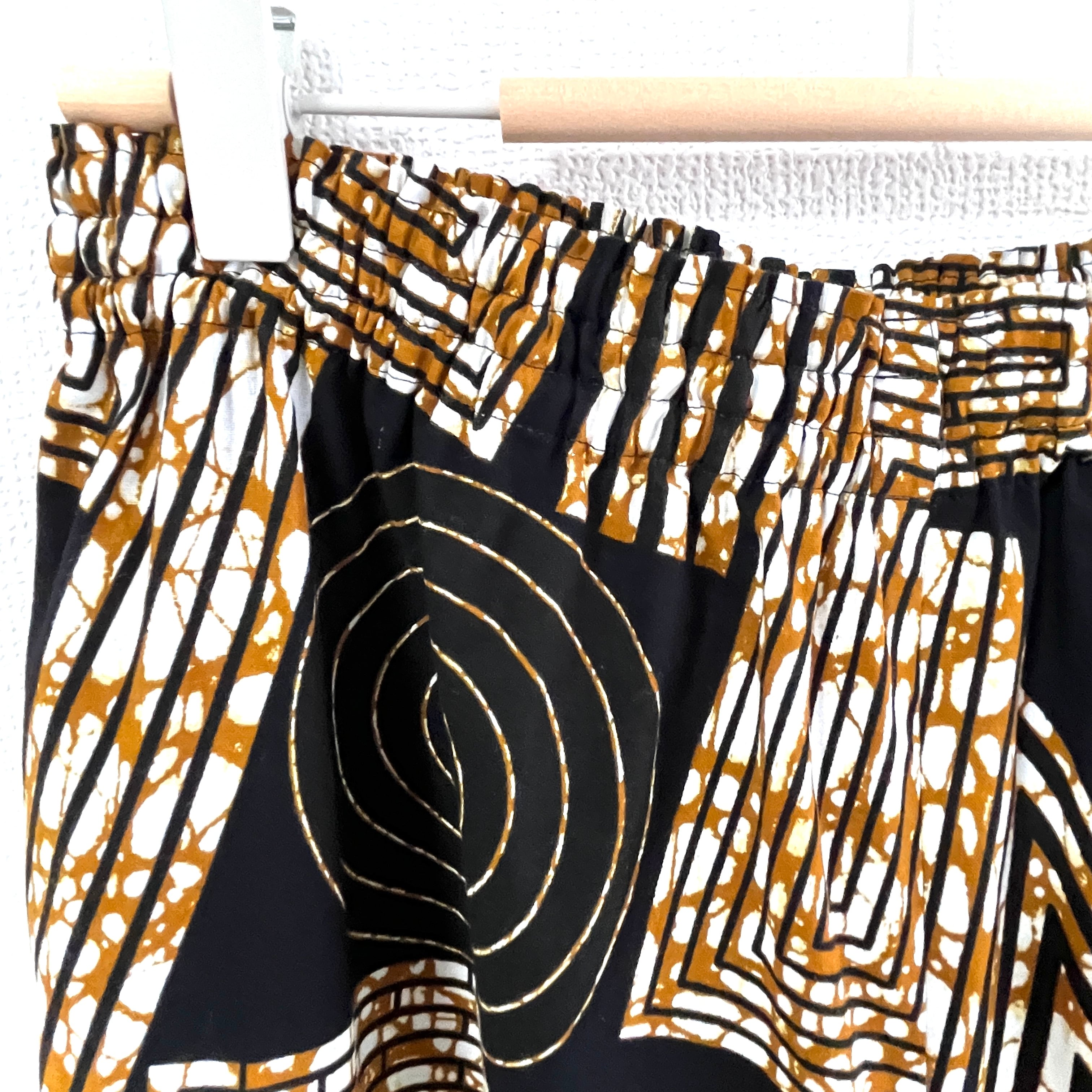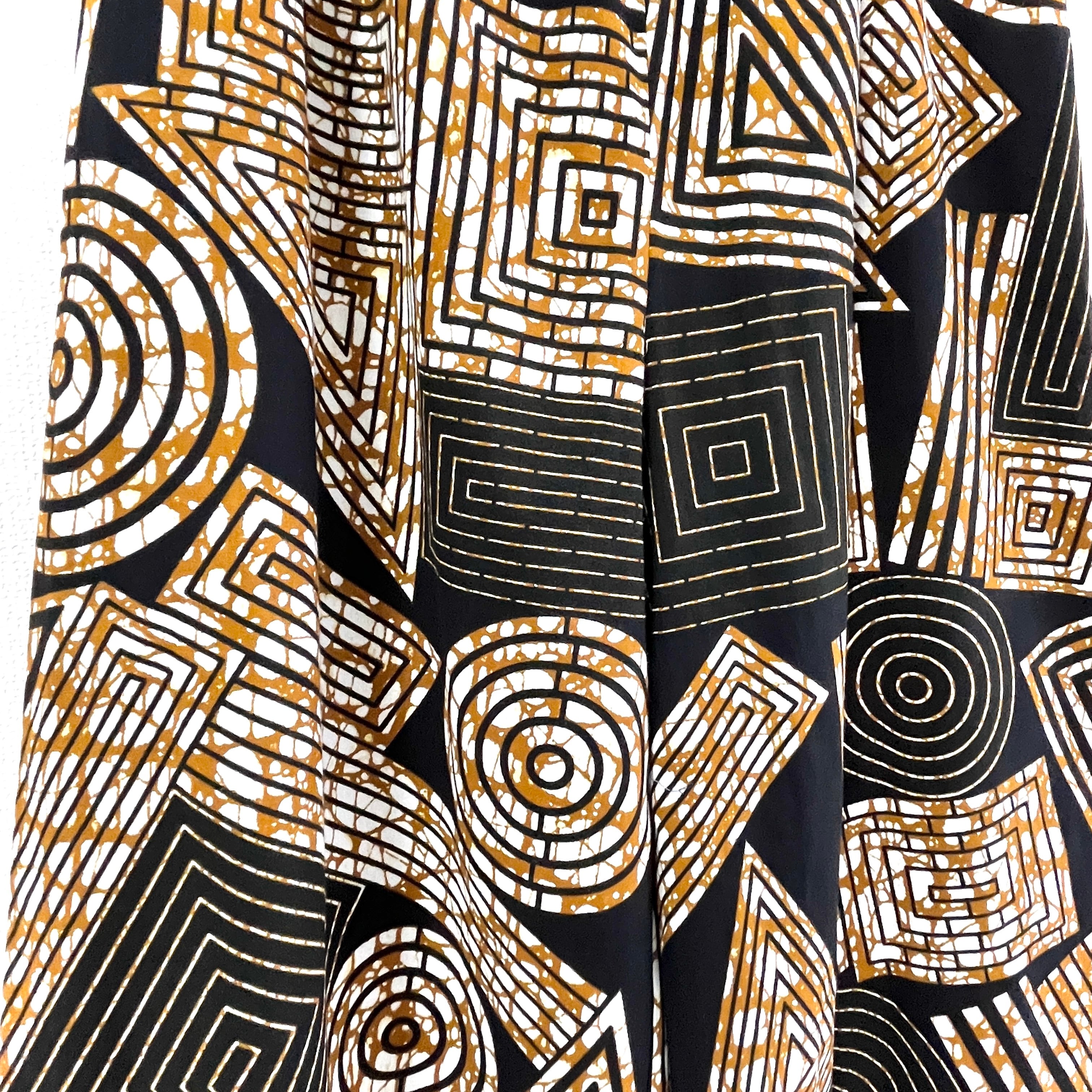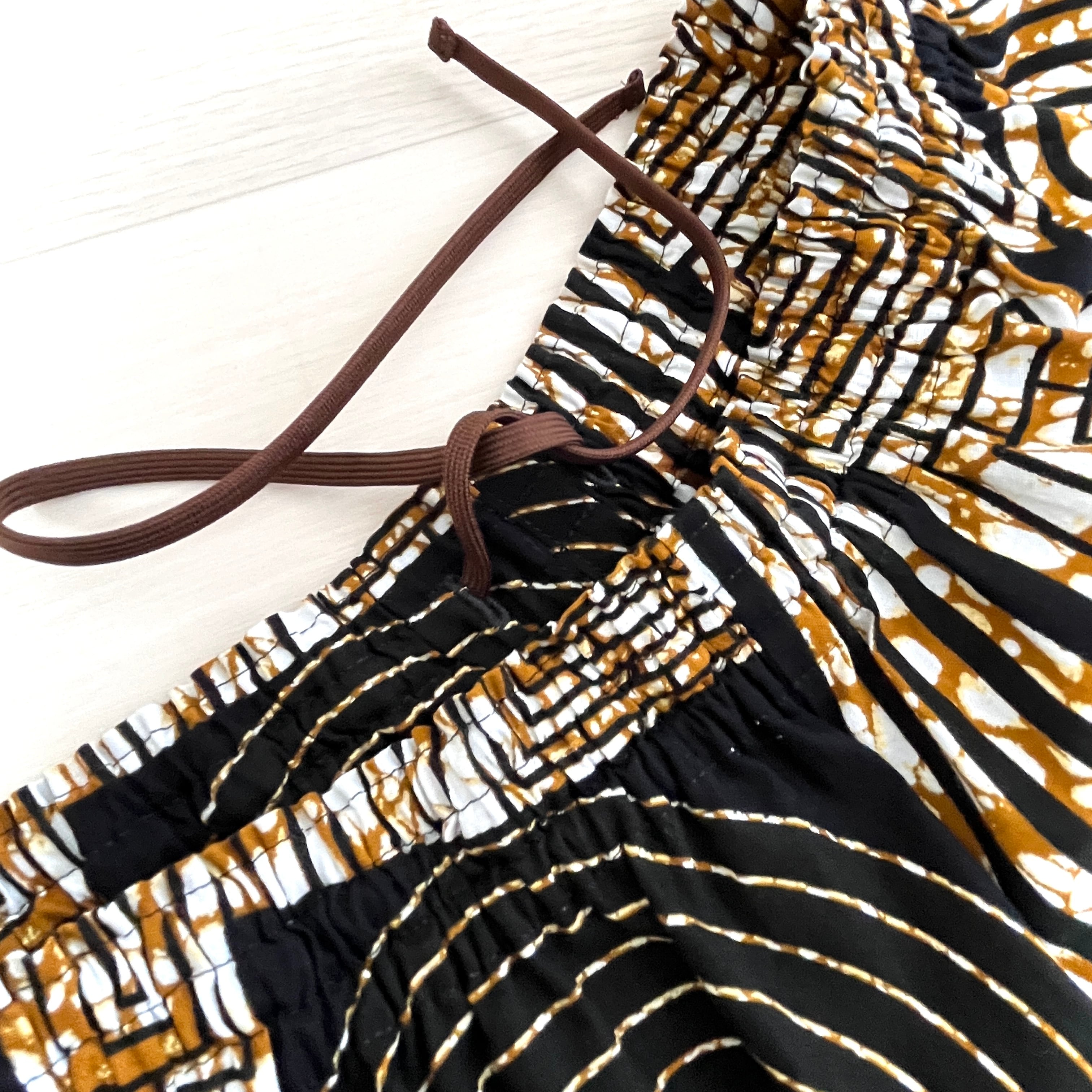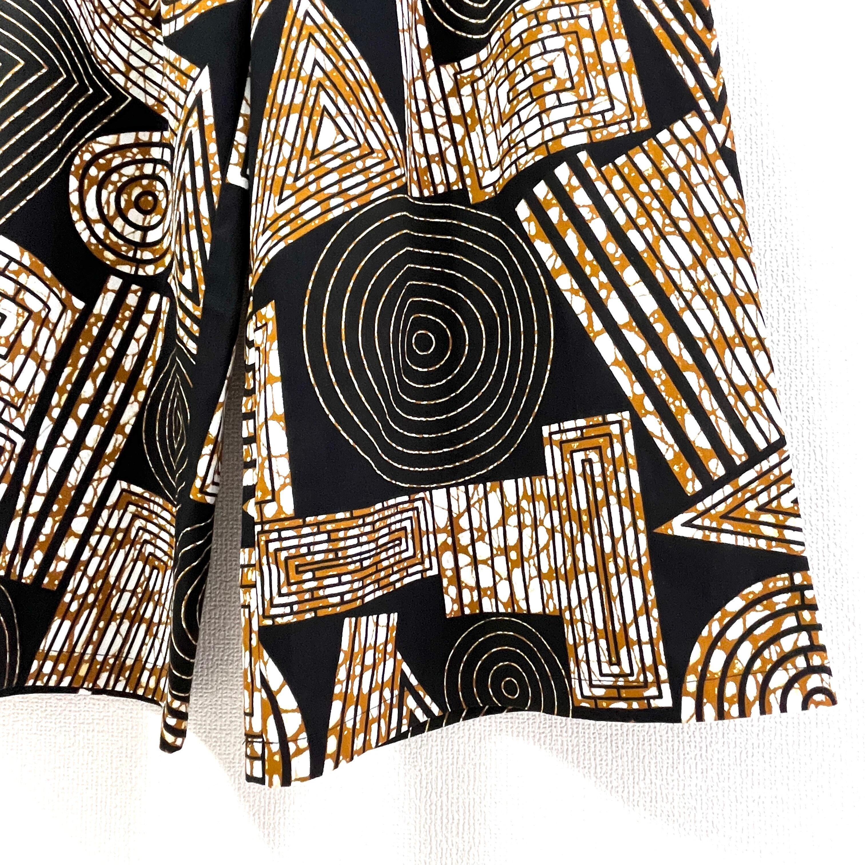 ・水通し済みですが、生地によってはアフリカンプリント特有の張り感が残っている場合があります。気になる場合はお洗濯してからご着用ください。(ご使用を重ねるうちに柔らかい質感になっていきます。)