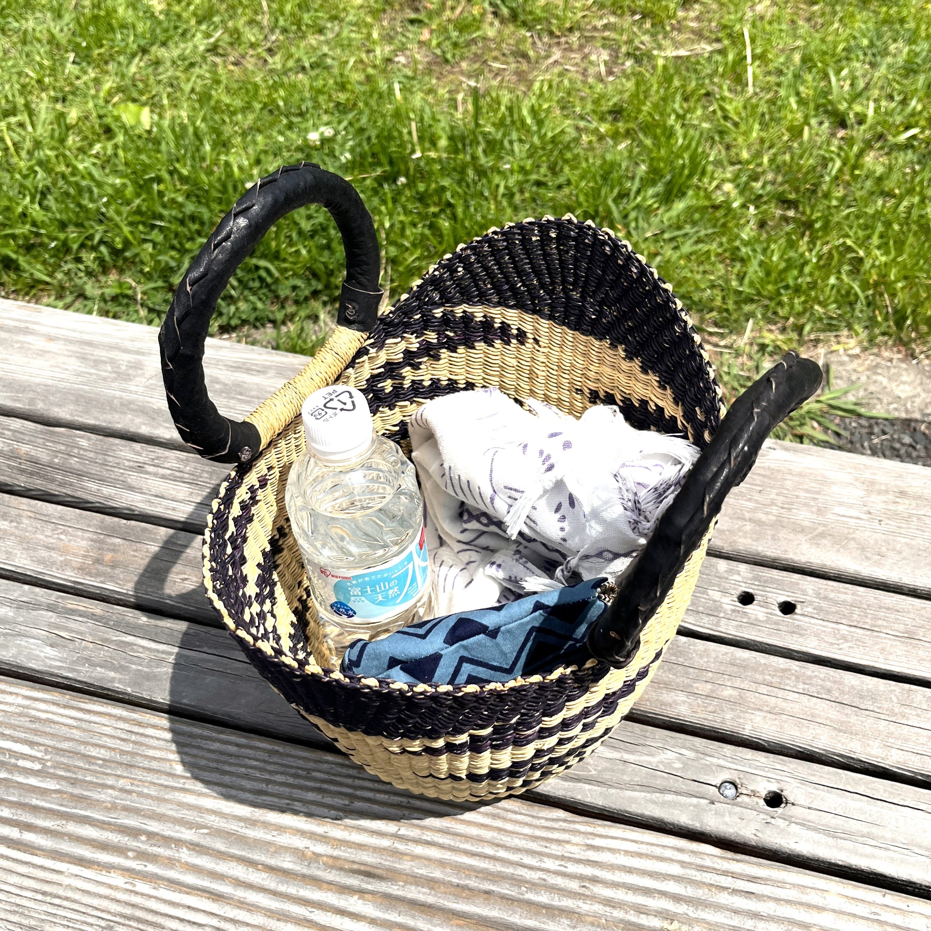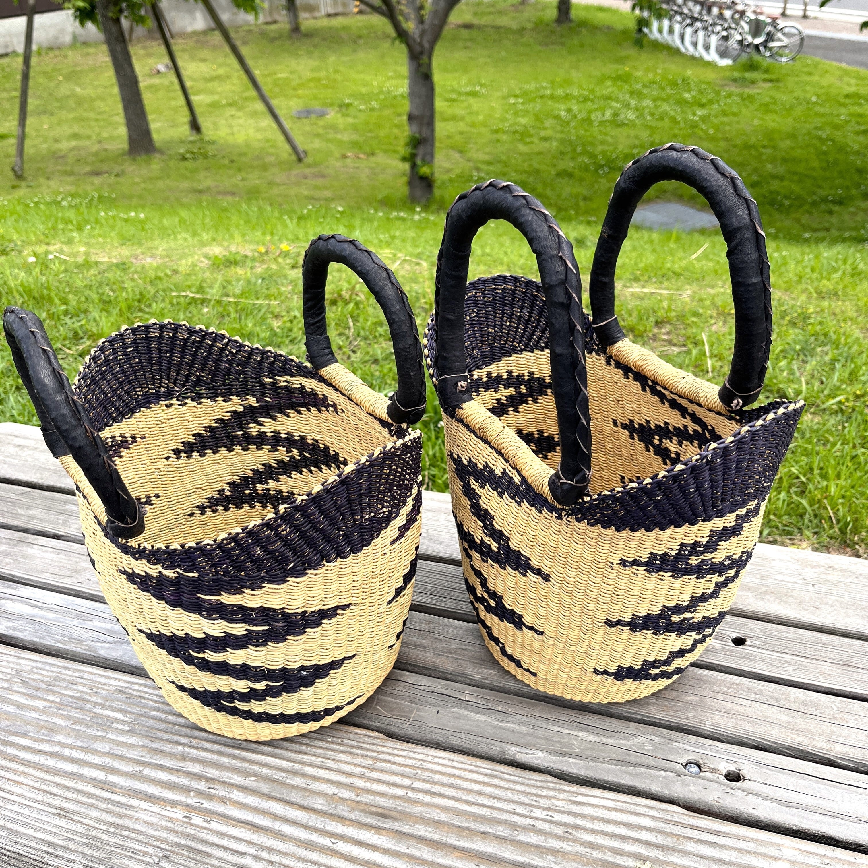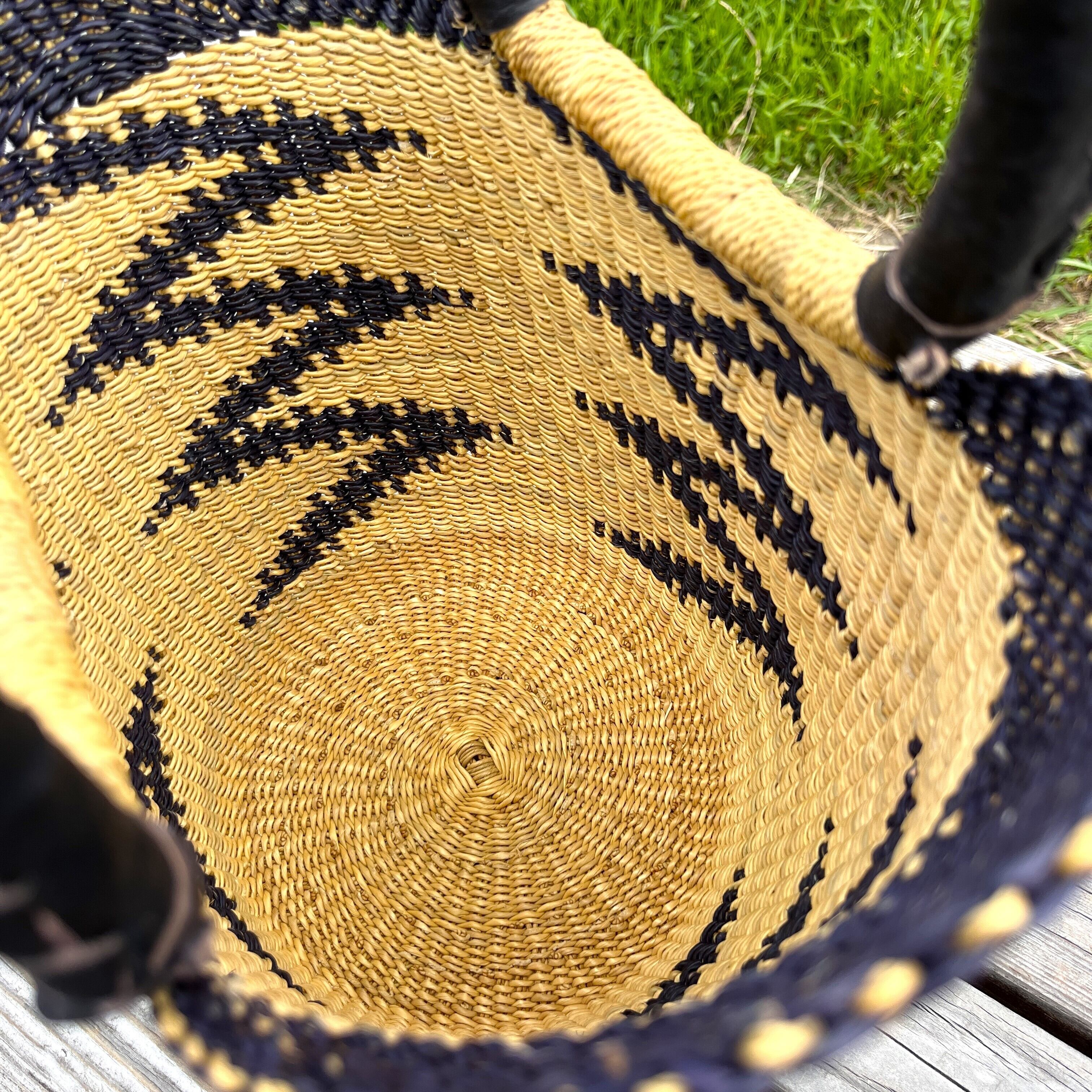 ニアリガ丸底バスケット/伝統柄(黒)/黒革ハンドル(ブルキナ・ガーナバスケット)