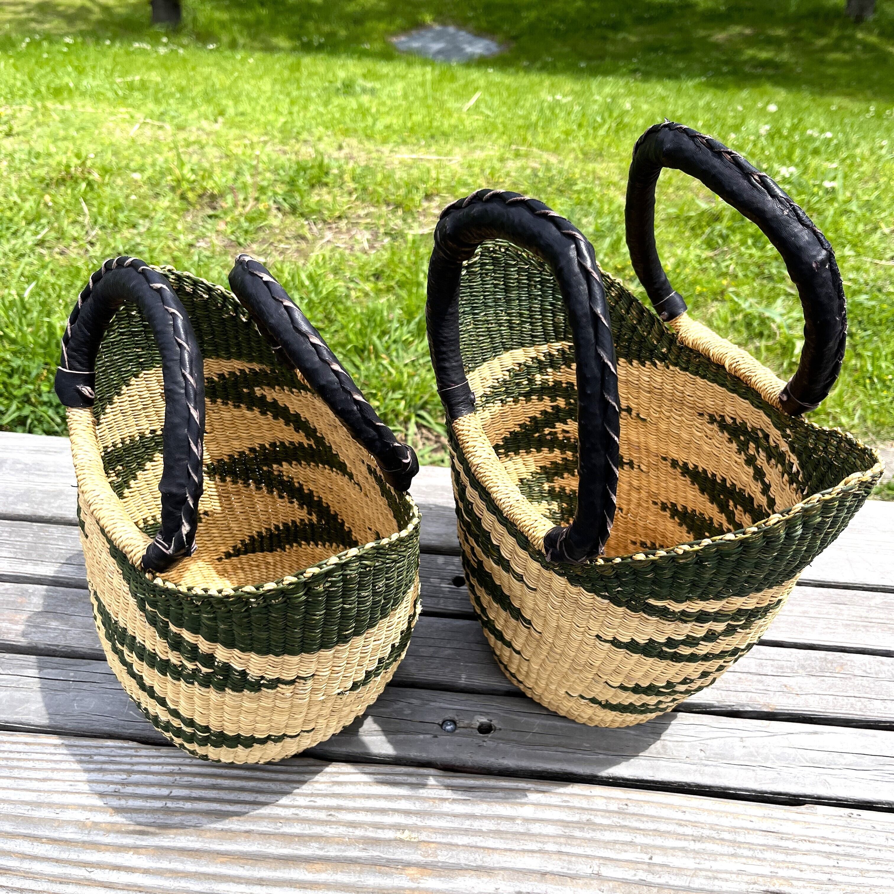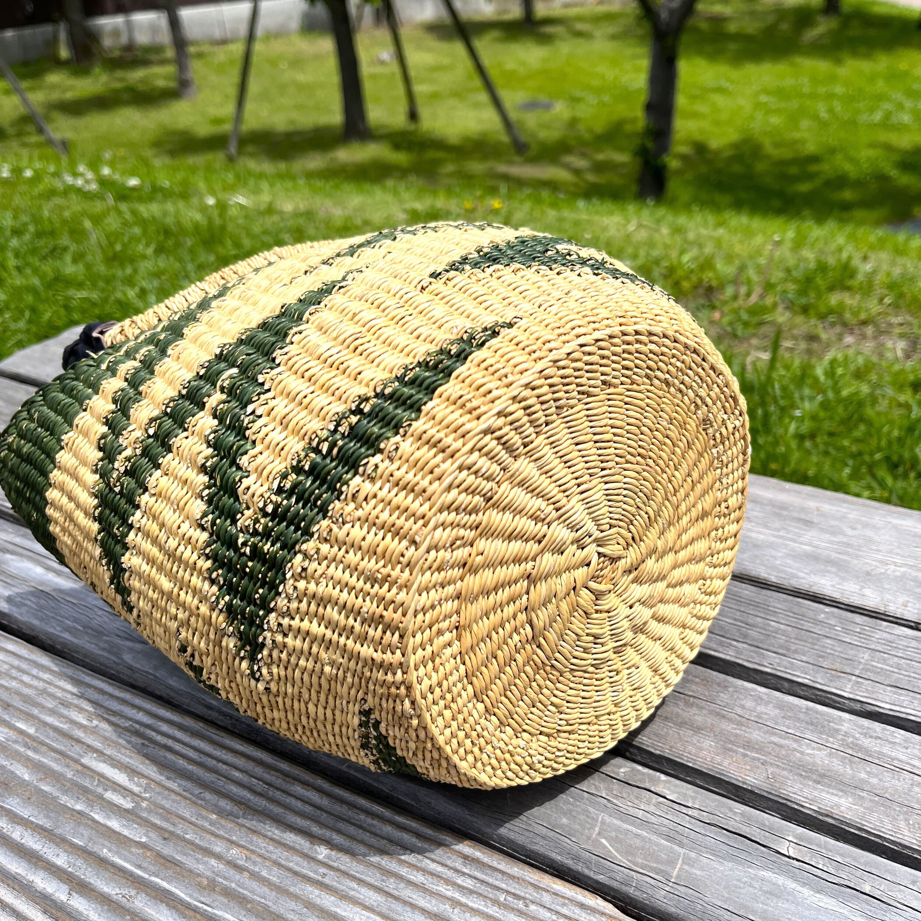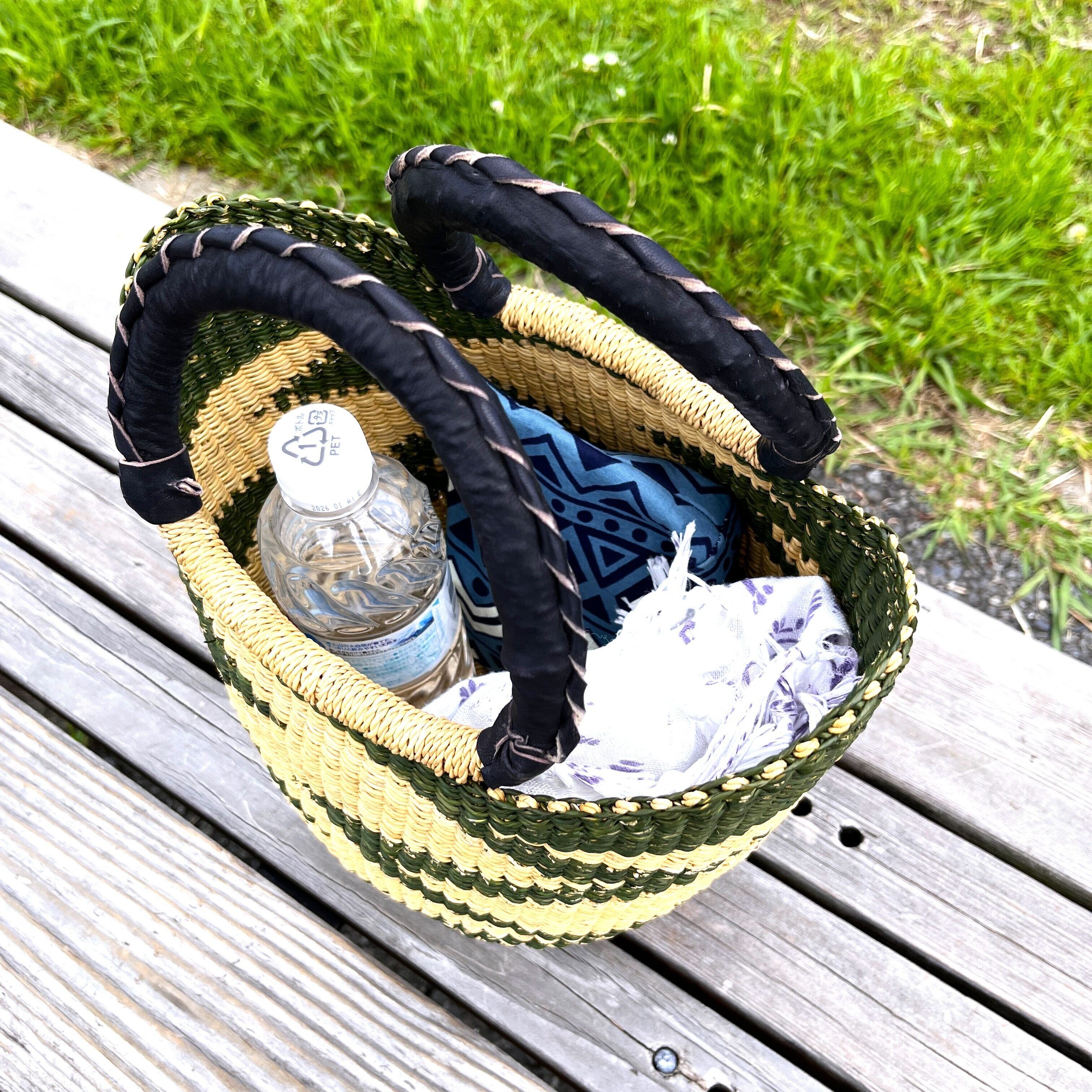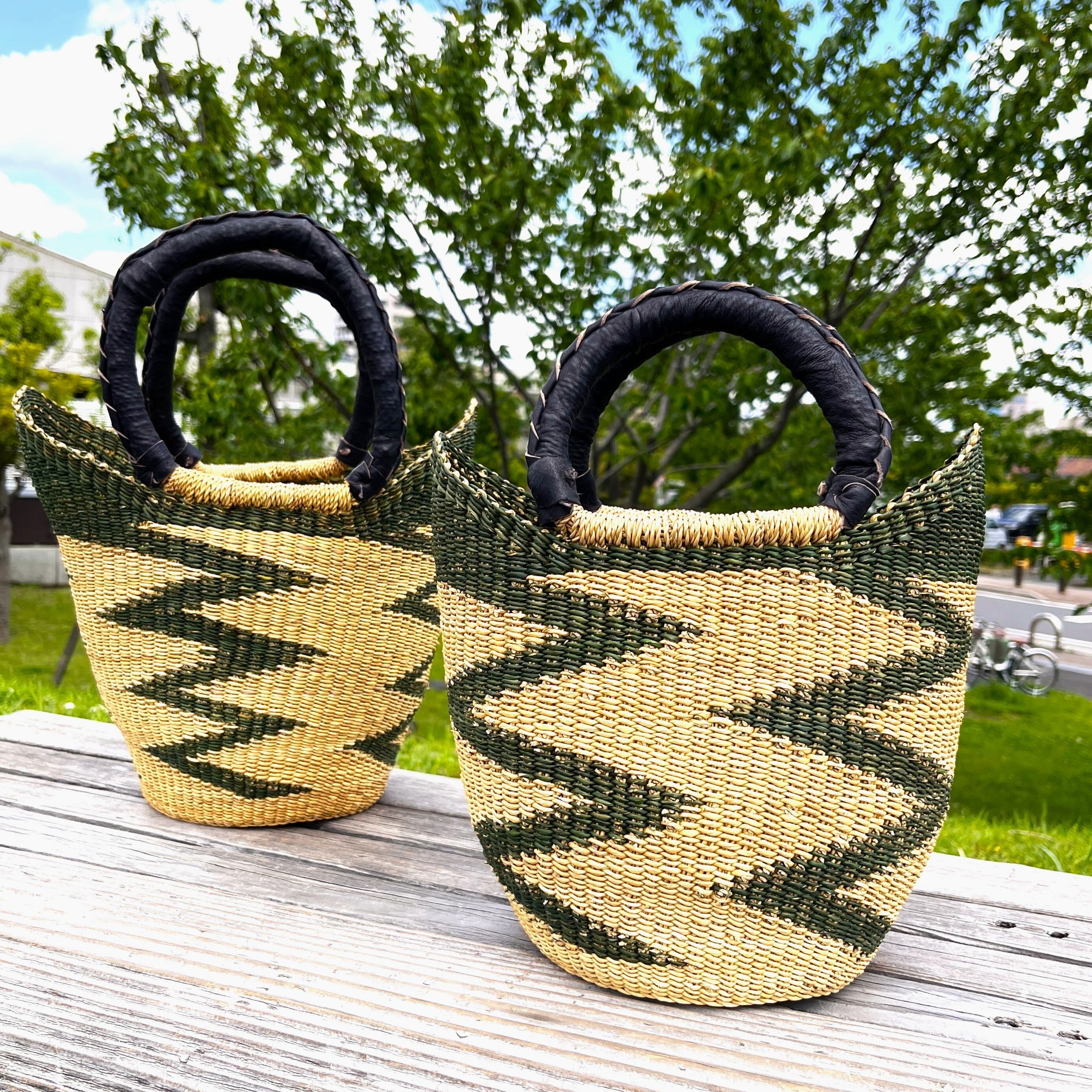 ニアリガ丸底バスケット/伝統柄(緑)/黒革ハンドル(ブルキナ・ガーナバスケット)