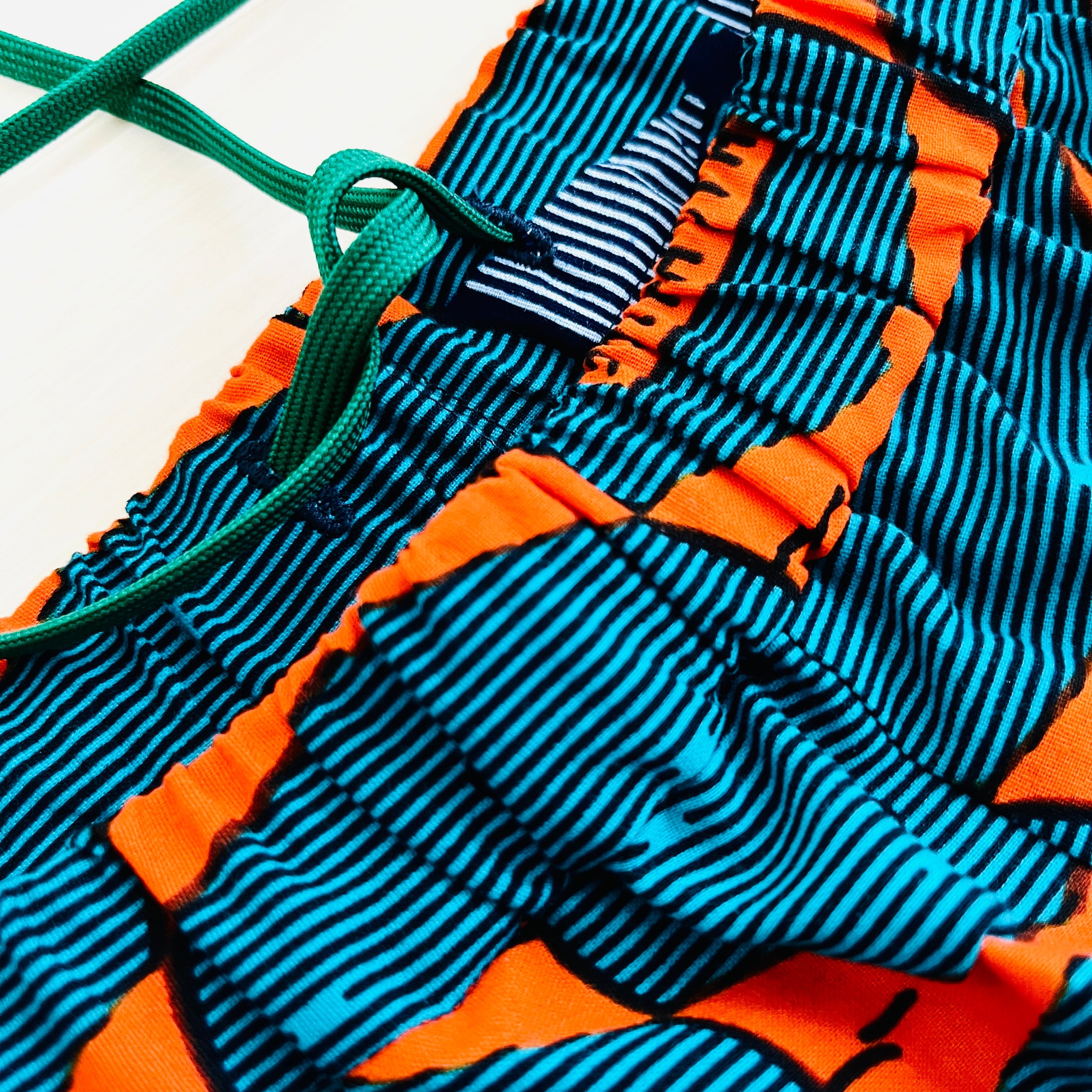 ・水通し済みですが、生地によってはアフリカンプリント特有の張り感が残っている場合があります。気になる場合はお洗濯してからご着用ください。(ご使用を重ねるうちに柔らかい質感になっていきます。)